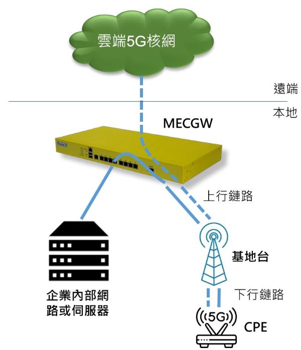 正常情況下,5G RAN的基地台,通過下行無線鏈路同時連接多個無線上網終端 (例如CPE或手機) ,並通過上行有線鏈路連接至核心網路 。MECGW 則以透通方式嵌入基地台的上行鏈路,開闢了一條資料傳輸的捷徑:在上行鏈路的前段執行本地跳脫 (Local- Breakout),使得無線上網終端可以直接存取邊緣資料中心或企業內部網路的運算資源,降低延遲並確保資料安全。